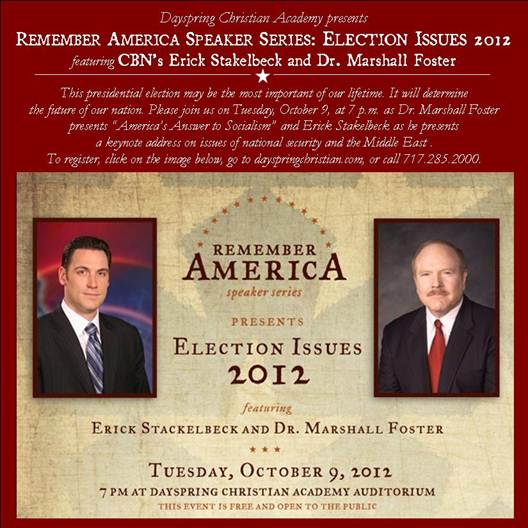 Don’t miss Erick Stakelbeck, an expert on national security and the Middle East, and Dr. Marshall Foster of the World History Institute, who will speak on America’s Answer to Socialism, on Tuesday, October 9, at 7 p.m. at Dayspring Christian Academy’s Remember America Speaker Series: Election Issues 2012. After their presentations, the speakers will take questions and will be available for book signings.
