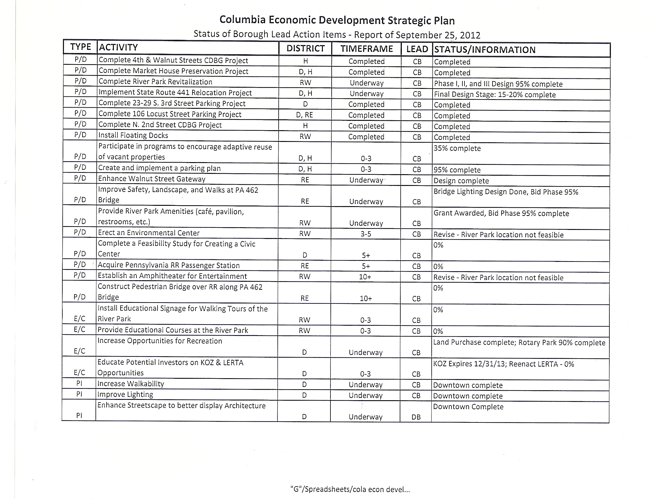 One purpose of this quarterly update meeting is for representatives to provide updates to their assigned “action items.” The action items were identified in the Plan beginning on page 43. Borough Manager, Norman B. Meiskey, III, handed copies of the “Status of Borough Lead Action Items” to everyone in attendance. Each of the entities and organizations initially identified have stated “action items” – none of these provided written updates.