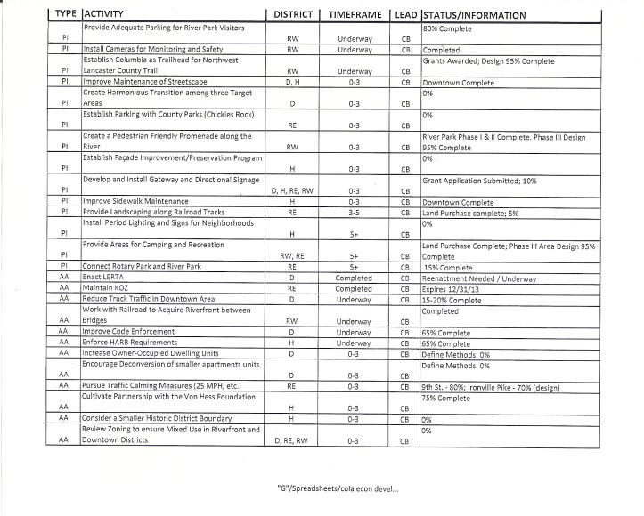 Borough councilor Renae Sears chaired the meeting, though many of those who were identified when the Plan was begun several years ago – the organizations and people are listed on page two of the Plan – were not at last night’s update meeting. The entire borough council, the mayor and the borough manager attended. Others in attendance, according to the initial list of represented agencies, included the Columbia Economic Development Corporation, the Columbia Borough Zoning Hearing Board; the Community Life Network; the Historic Architectural Review Board; the Lancaster County Planning Commission; the Old Columbia Public Grounds and the Susquehanna Valley Chamber of Commerce.