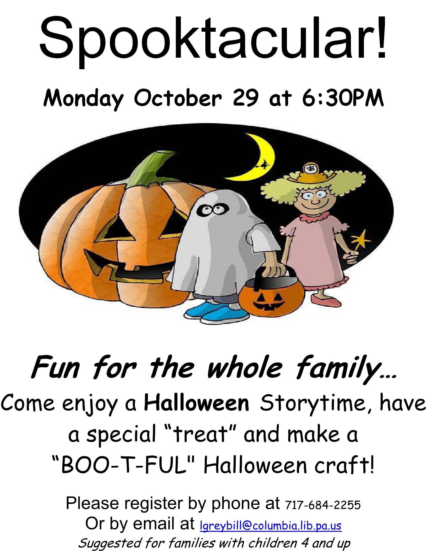 October 12, 2012October 12, 2012 17512 Columbia Library hosts “non-scary” Spooktacular for the entire family This is non-scary……ages four and up are welcome! It is for the entire family. Susan Kalas is directing the activities. Share this: Click to share on Facebook (Opens in new window) Facebook Click to share on X (Opens in new window) X Like Loading... Related