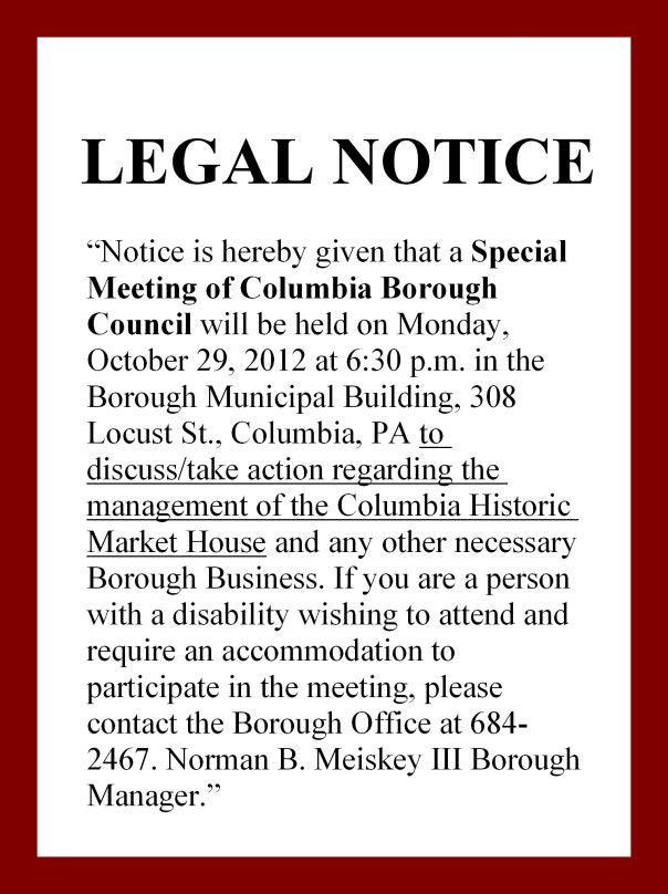 October 27, 2012November 7, 2012 17512 Columbia Legal Notice in today’s Lancaster Intelligencer Journal.New Era The contents of the notice below are published in the Lancaster Intelligencer Journal/New Era on Saturday, October 27, 2012. Share this: Click to share on Facebook (Opens in new window) Facebook Click to share on X (Opens in new window) X Like Loading... Related