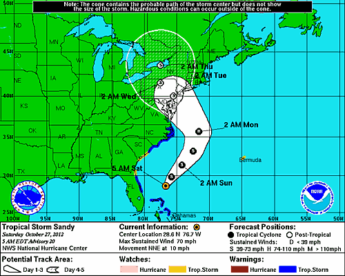 This is Sandy’s current projection from The National Hurricane Center at 6:30 am, 27 October 2012