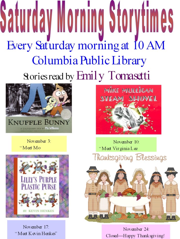 November 1, 2012November 1, 2012 17512 Columbia At your library: Saturday Morning Storytimes Share this: Click to share on Facebook (Opens in new window) Facebook Click to share on X (Opens in new window) X Like Loading... Related
