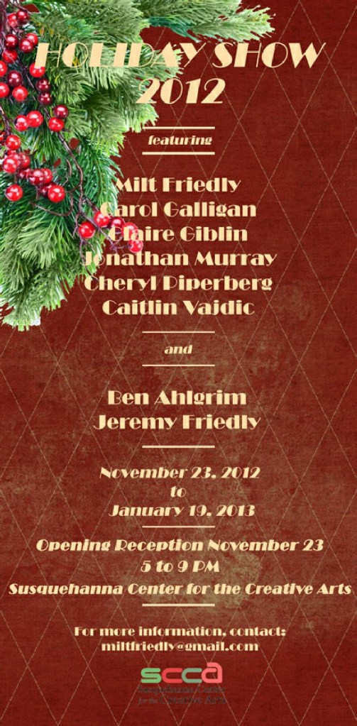 The Susquehanna Center for the Creative Arts (SCCA), 452 Locust Street, Columbia, will host a holiday show featuring resident artists Nov. 23 2012 through Jan. 19 2013. An opening reception is scheduled for Friday, Nov. 23 from 5-9 PM. Regular gallery hours are Tuesday, Wednesday, Friday, 2-4 PM; Saturday 1-5 PM; Thursday 4-7 PM or by appointment.