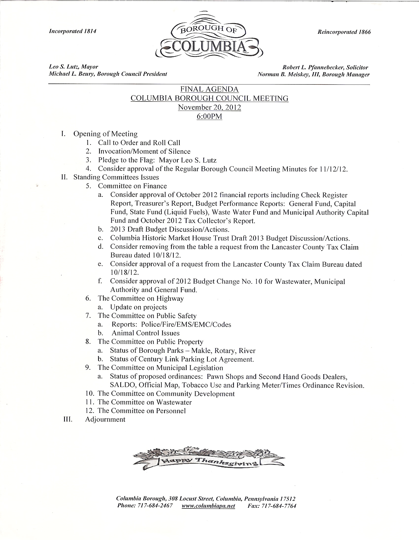 Each of the councillors led discussion for the separate Committees for which they held chair ownership. Deliberate conversation of Finance Committee matters, including the 2013 Budget, police department staffing; police department overtime; the borough’s fee schedule; animal control and other issues, held the spotlight for the first part of the evening.