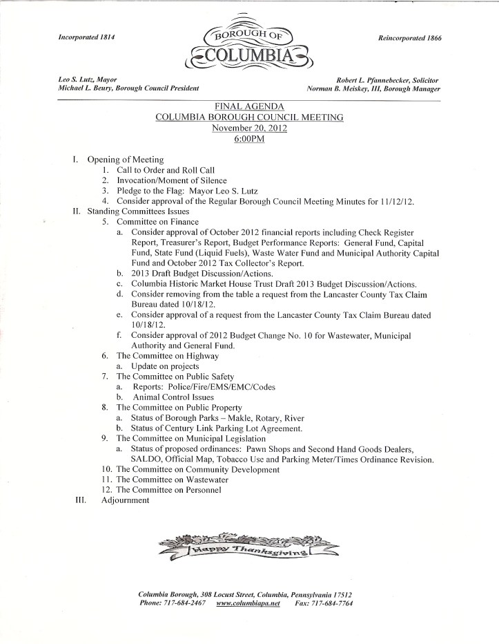 When the meeting convened at 6:03 pm, the entire council, the mayor, the borough manager, the borough financial officer, the police chief, a recorder and three citizens were present. The borough officials mashed through the agenda items until the meeting was ended at 9:57 pm.