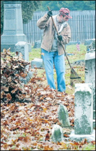 Volunteer Rich Bair rakes leaves from among gravestones in Columbia’s Mount Bethel Cemetery.