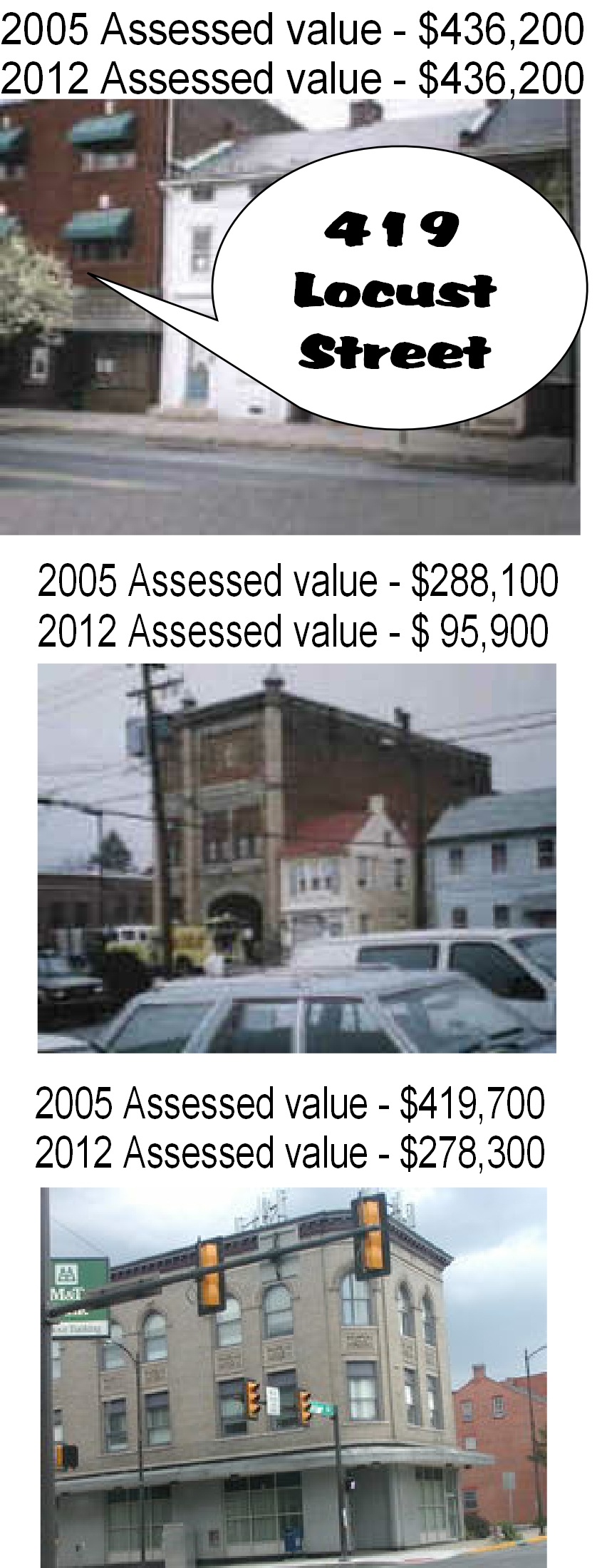 - This smaller sampling of properties on Locust and Third Streets owned by a “Big” property owner/landlord had assessed values of $318,500 in 2005; $257,700, in today.