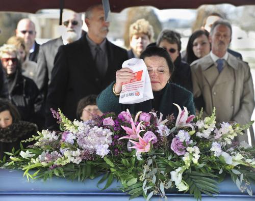 Linda Phiel places a WHOPPER Jr. on the casket to be buried with her father David Kime Jr. at Prospect Hill Cemetery on Saturday. Phiel and other mourners went through the drive-through at Burger King and each got the hamburger in his honor. ( YORK DAILY RECORD/SUNDAY NEWS–JASON PLOTKIN)