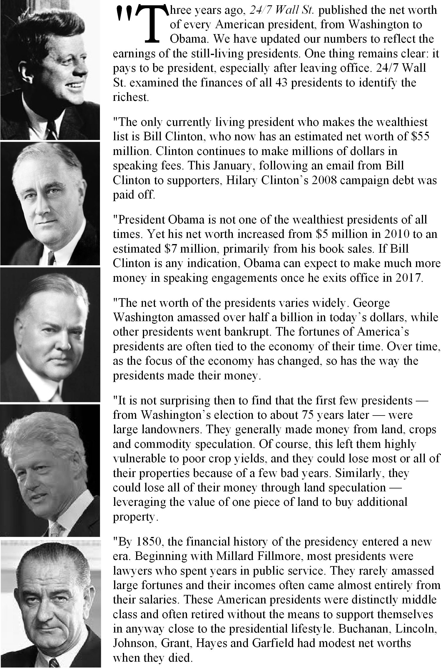 Click on the above graphic to enlarge and to read this 24/7 Wall St. article in its entirety and to see the top 10 Wealthiest Presidents, click here.