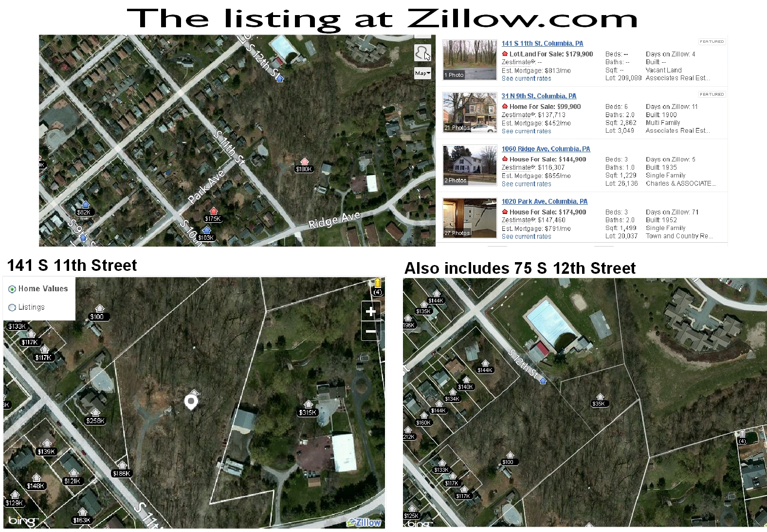 “141 S 11TH STREET COLUMBIA , PA 17512 Wonderful undeveloped tract of ground in a desireable [sic] Columbia neighborhood. Create your own mini estate or explore subdivision possibilities. Public utilities available too! Close to schools. Also includes 75 S 12th St, Tax Id 110-6840500000.”