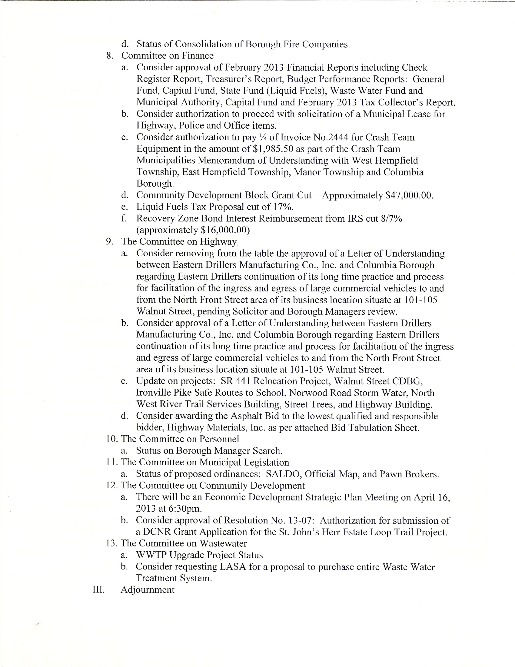 Suicide. The mayor announced that he and the police chief are spearheading a community meeting on April 30. He said notification would be sent to virtually everyone encouraging the community to attend. He has been in communication with Lancaster city housing authorities about a “block by block improvement” process that has been in place in the City. His hope is that a similar program will improve some of the conditions that exist in Columbia. He followed that conversation by stating that earlier in the day, the police discovered a person who had committed suicide in an apartment with no running water and no heat. The mayor said the property has been problematic for years.