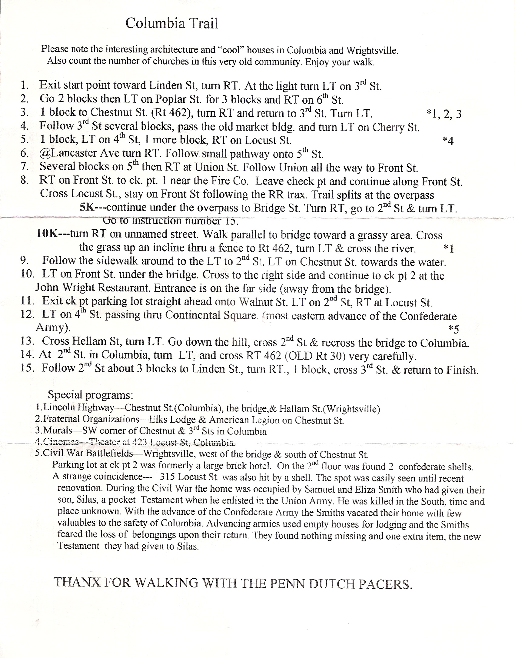 Everyone got an instruction sheet (a route map) at the start point and click here for the information sheet about the Columbia Trail at the Penn Dutch Pacers Website.