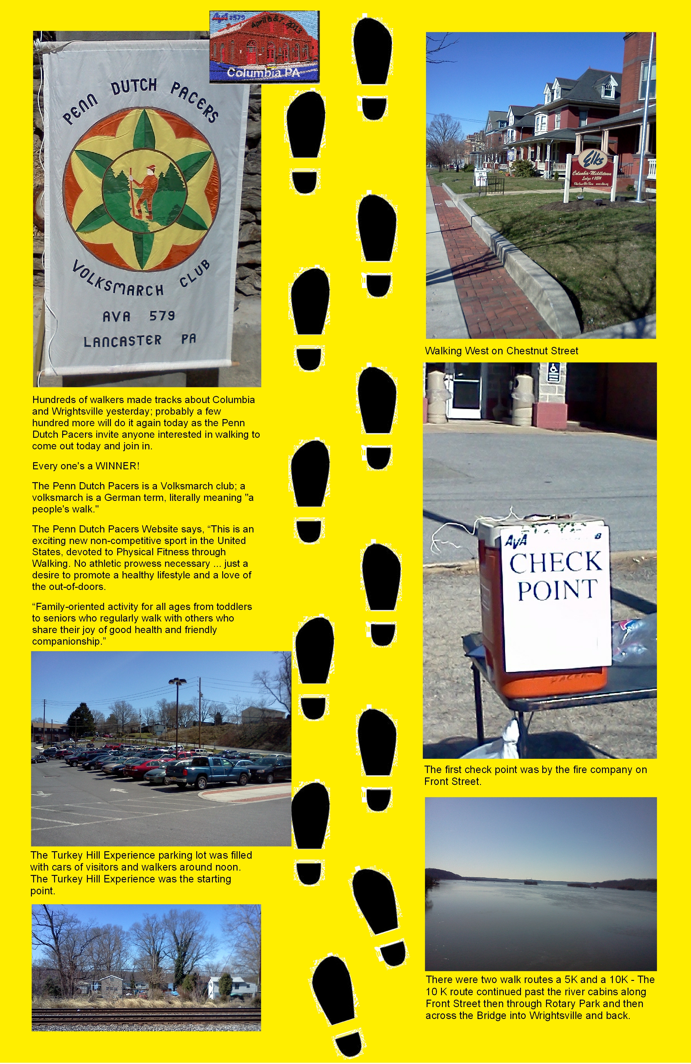 On the Wrightsville side (Clockwise from top right: The 10 K check in point at John Wright Factory Outlet. Ralph Greenawalt, Pacer check-in checker (NOTE: Ralph’s walked in more than 200 Pacer events.) Walkers check in with Ralph. The Welcome to Wrightsville sign; a bridge marker and the “mighty” Susquehanna.