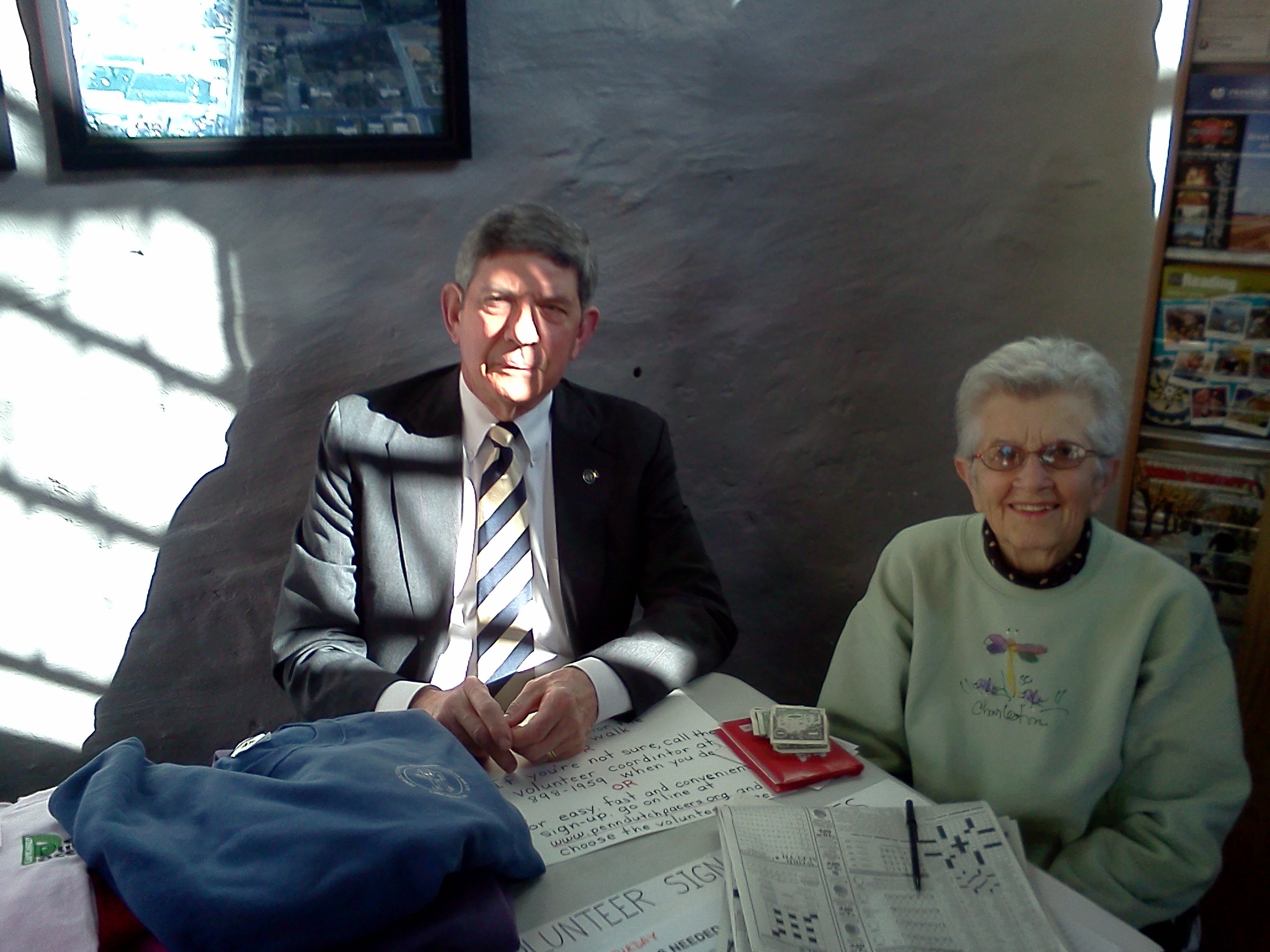 Club officers, Pete Byrne, president and Kitty Glass, treasurer, welcome walkers at the start point check in.