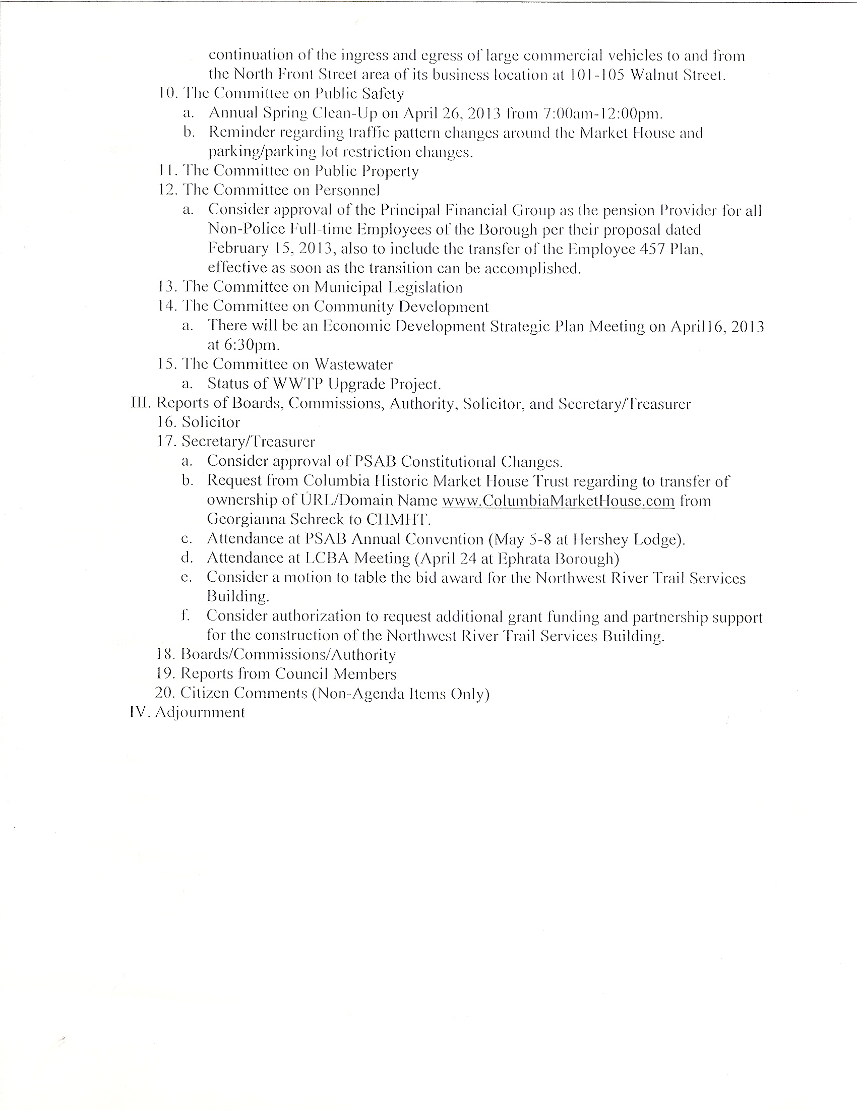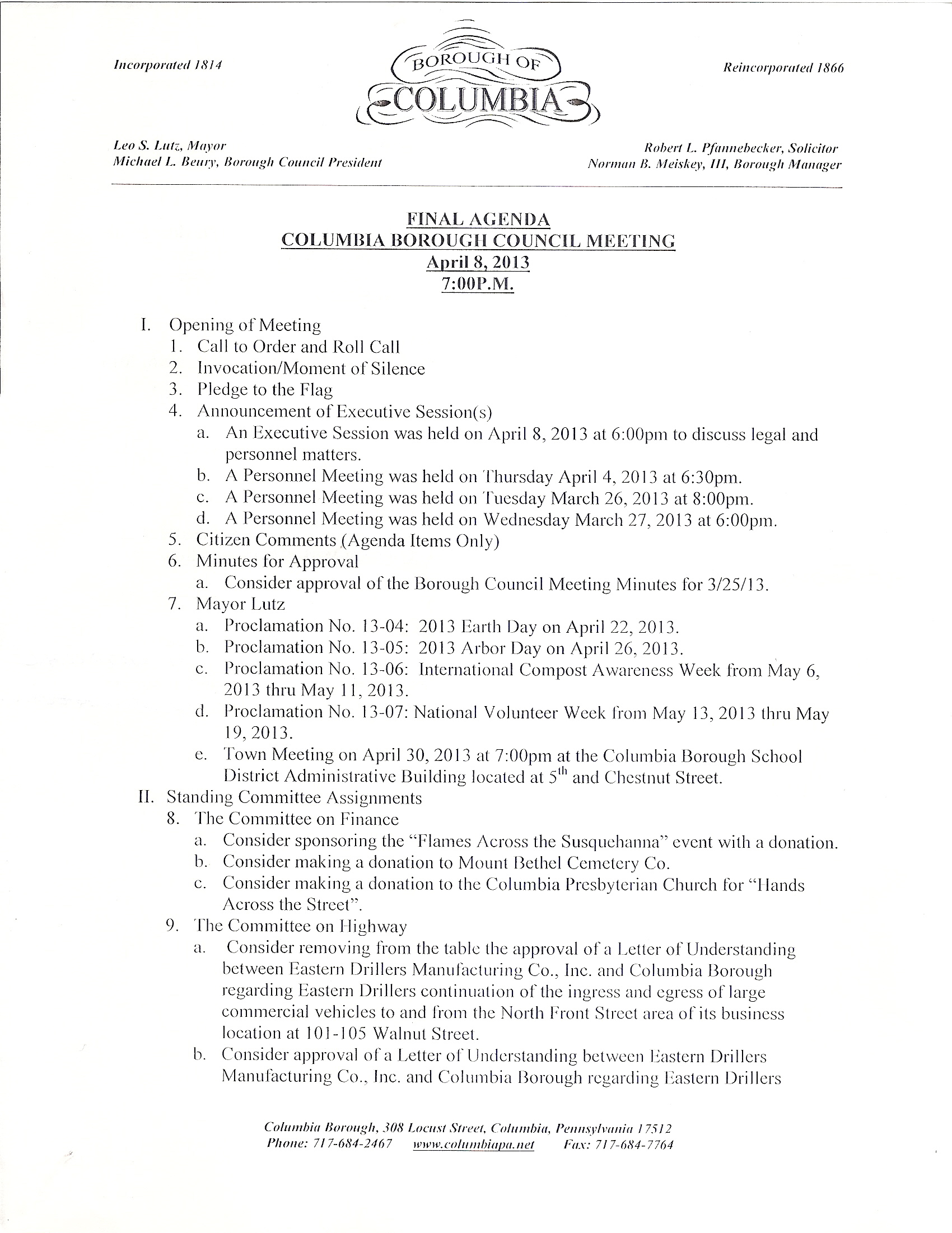 And a trio of Lancaster Catholic High School students were at the meeting; area Lancaster Catholic High School students have been frequent observers of local government at the borough council meetings. Solicitor Robert L. Pfannebecker opined to the high school students that Columbia’s local governance is more spirited and has more lively debate and discussion than most county municipal governments.