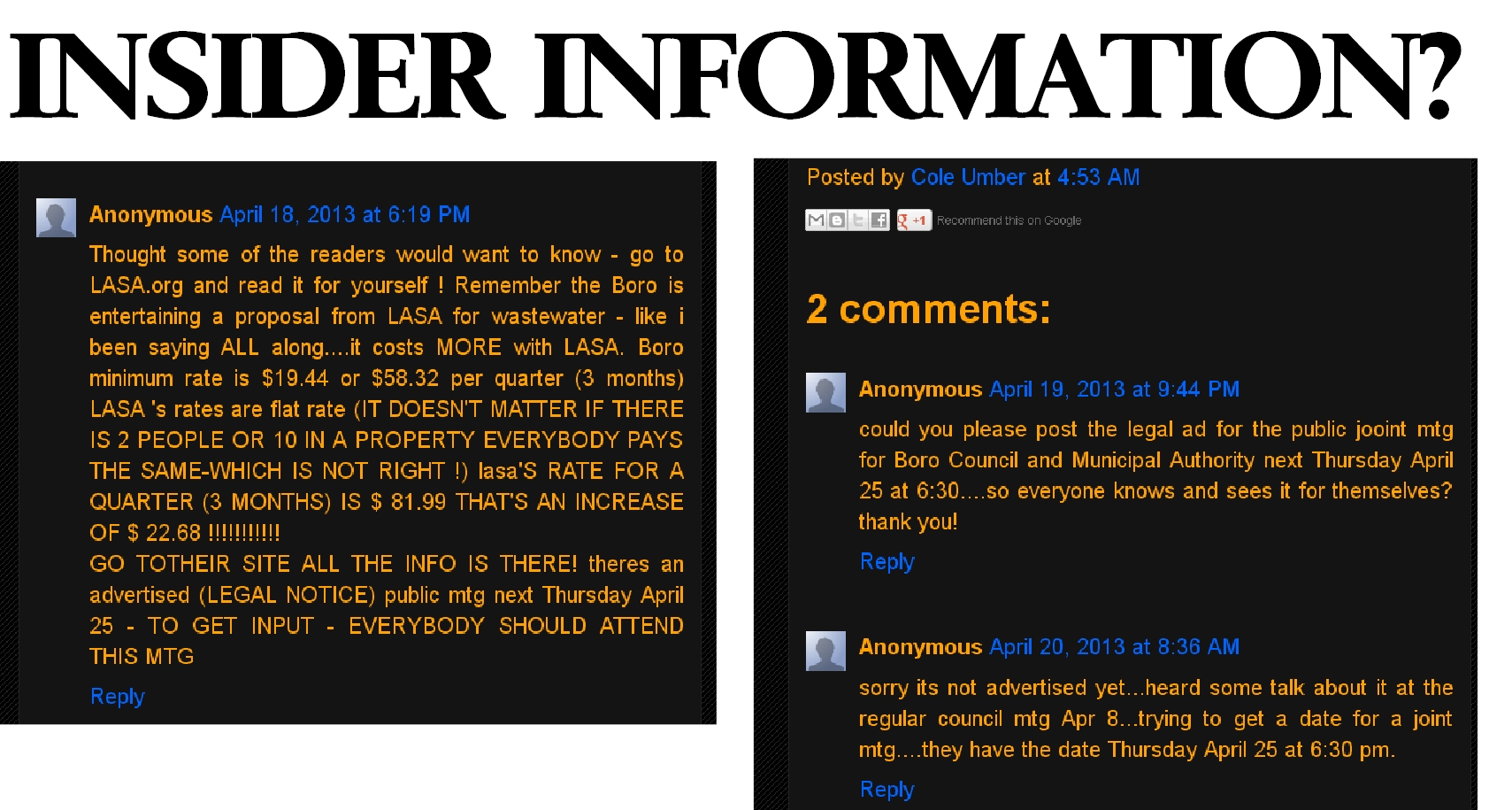 Wonder which insider might have information that a LEGAL NOTICE announcing the date and time of the yet-not-announced meeting would be published? A borough employee? Someone from the municipal authority? Someone who supports retention of the Columbia wastewater system and has inside information about borough functions?