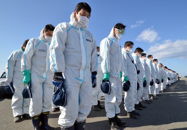 Police officers in radiation protection suits pray for tsunami victims last month on the second anniversary of the disaster. Yoshikazu Tsuno/Agence France-Presse — Getty Images