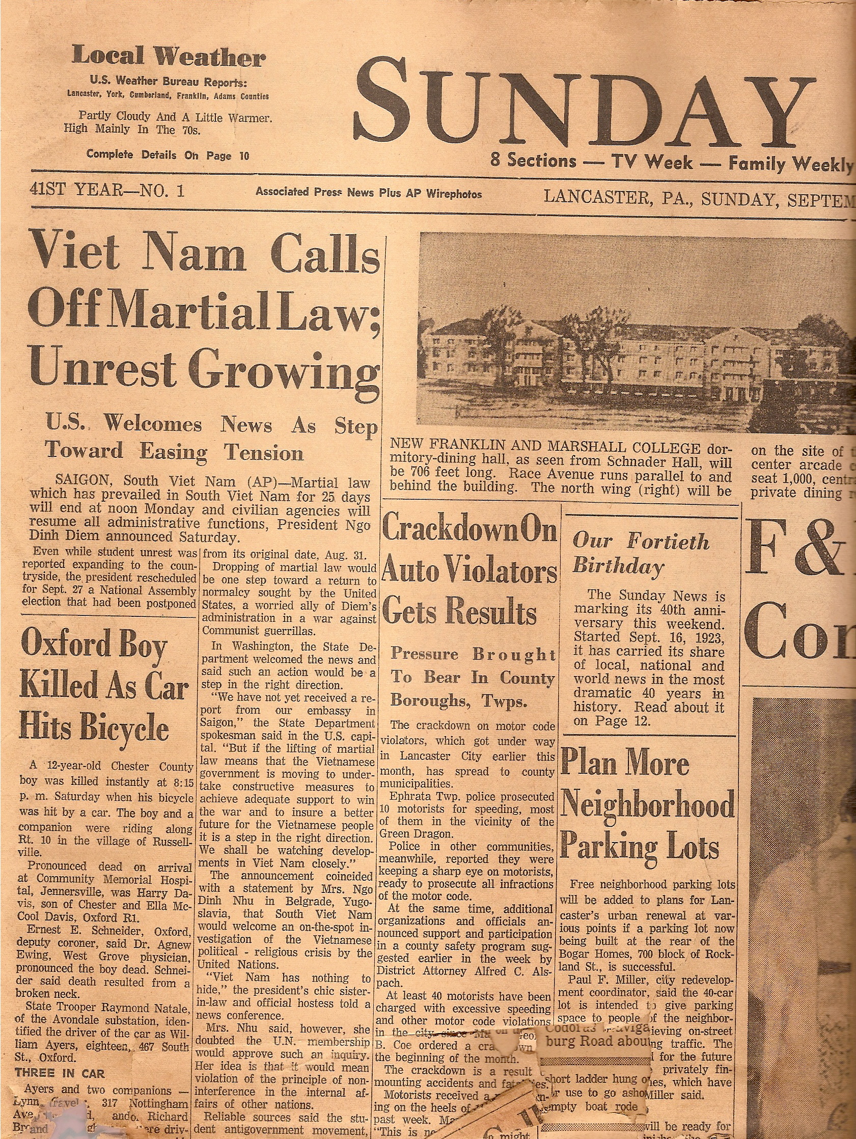Happened onto a couple of frail pages from an old Sunday News recently. Pages 1-2-15 & 16 of the September 15, 1963 Sunday News contain history of that time in this nation’s life. We scanned articles from some of the brittle, yellowed pages from almost 50 years ago.