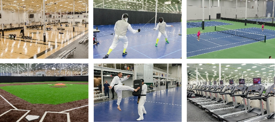 There are 10 full-length basketball/volleyball hardwood courts, six tennis courts surfaced in the same material as the U.S Open, AstroTurf ® fields for a variety of sports including soccer, futsal, field hockey, dodge ball and more. A full-sized baseball diamond infield, eight batting cages and pitching lanes offer training for baseball and softball players.