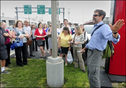 Public health consultant Mark Fenton, former host of PBS’ “America’s Walking” series, guides a “walkability audit” around Lancaster. (Blaine T. Shahan / Staff) – SOURCE: Intelligencer Journal/Lancaster New Era