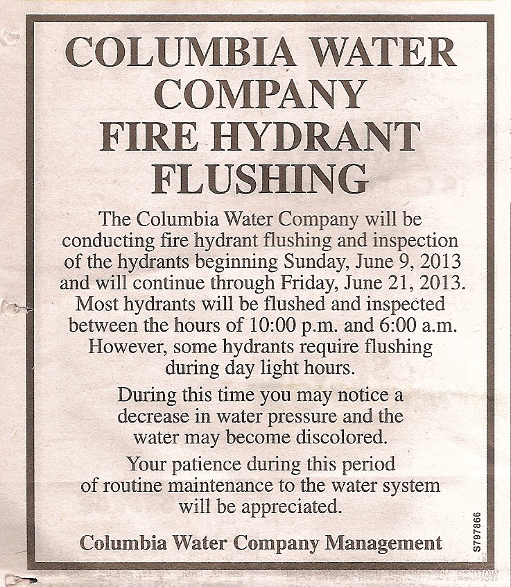 • Interesting that the above ad appears in the June 12 issue of The Merchandiser; try to find anything about the hydrant flushing at the Columbia Water Company Website. What great communicators … the Columbia Water Company Management.