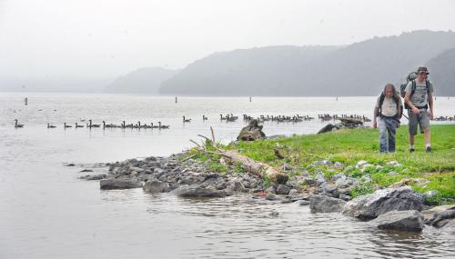 From the left, Tom Ray, of Lancaster, and Jono Droege, of West Hempfield Township, walk on Tuesday along the Susquehanna River in Lower Windsor Township as part of a 64-mile trek from Long Level to Havre de Grace, Md. (DAILY RECORD/SUNDAY NEWS – PAUL KUEHNEL)