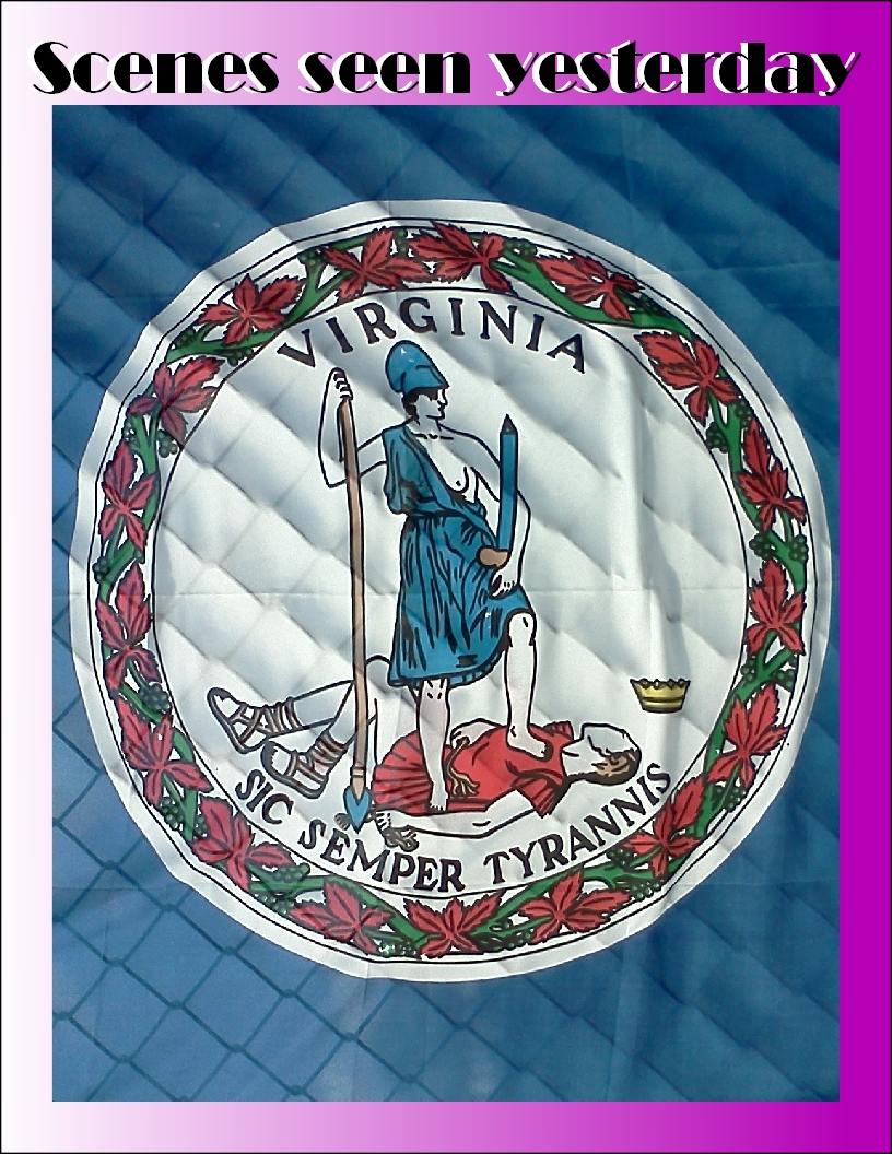 Center part of one of the flags hanging on the chain link topped with barbed wire fence at River Park. Great message … now if we could only correctly identify this country’s tyrants.