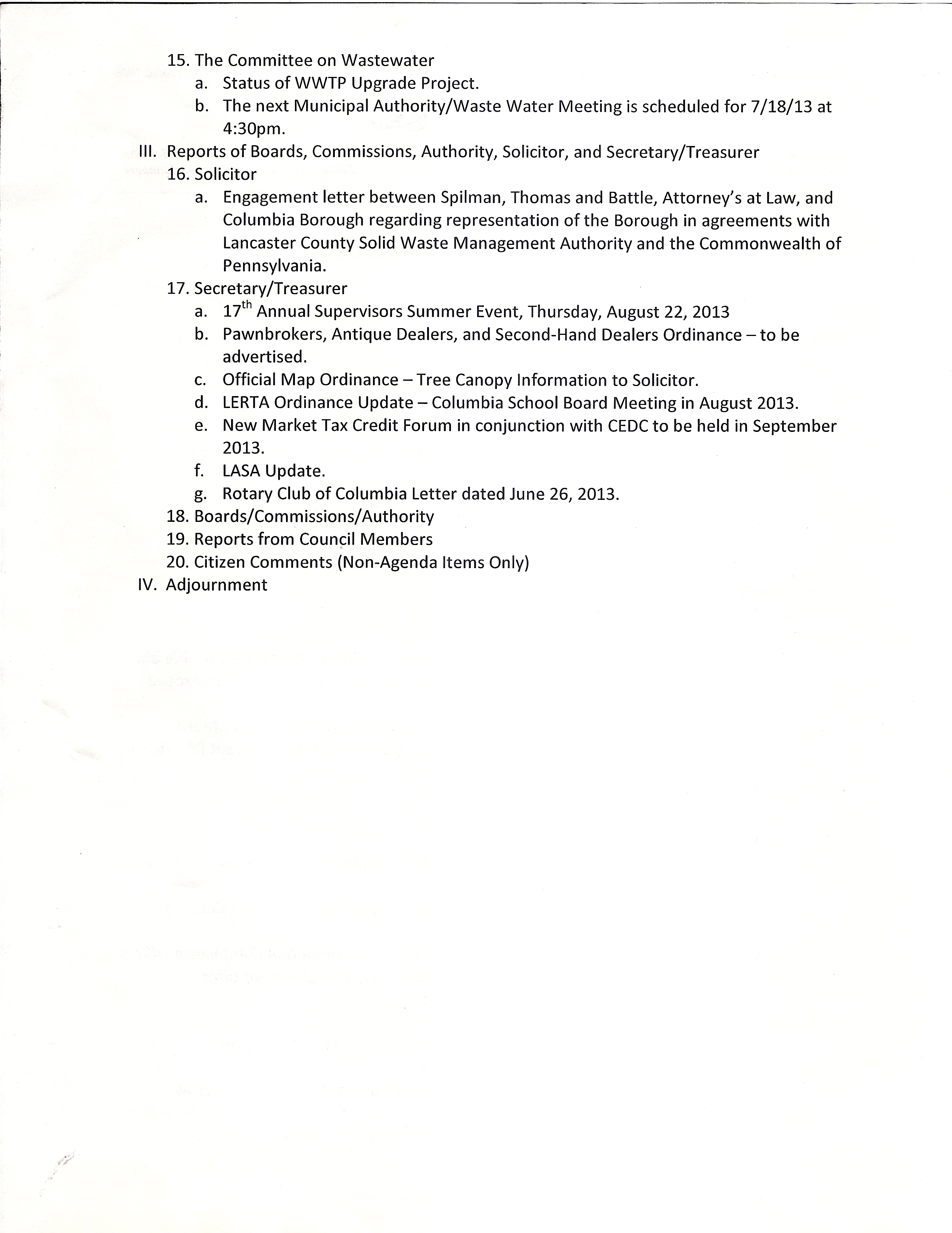 A citizen asked for clarification on agenda item III, 17., e.: “New Market Tax Credit in conjunction with CEDC (Columbia Economic Development Corporation) to be held in September 2013.” The borough manager explained the credit was a federal tax one. Click here to learn more about the New Markets Tax Credit (NMTC) Program.