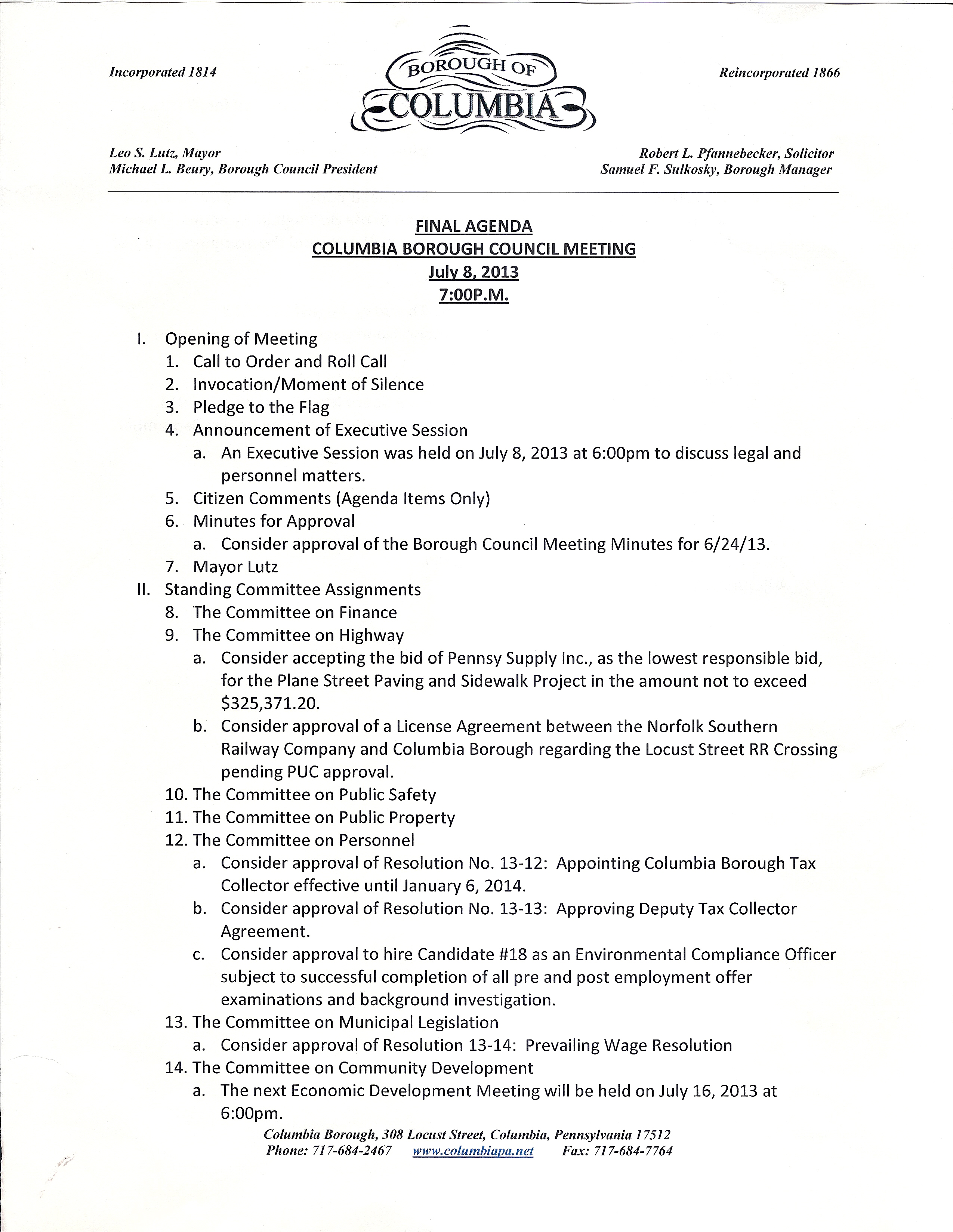 Columbia’s borough council met last night in the monthly meeting. Six of the councillors were present as the meeting was convened at 7:00 pm; councillor Jodi Gable was absent due to a work conflict. Also present for the meeting was the mayor, the borough manager, the borough financial director, the borough’s solicitor, the recorder, a newspaper correspondent and a handful of citizens. Later in the evening, two more people joined the audience – a property owner and a resident. The meeting was adjourned at 8:55 pm.