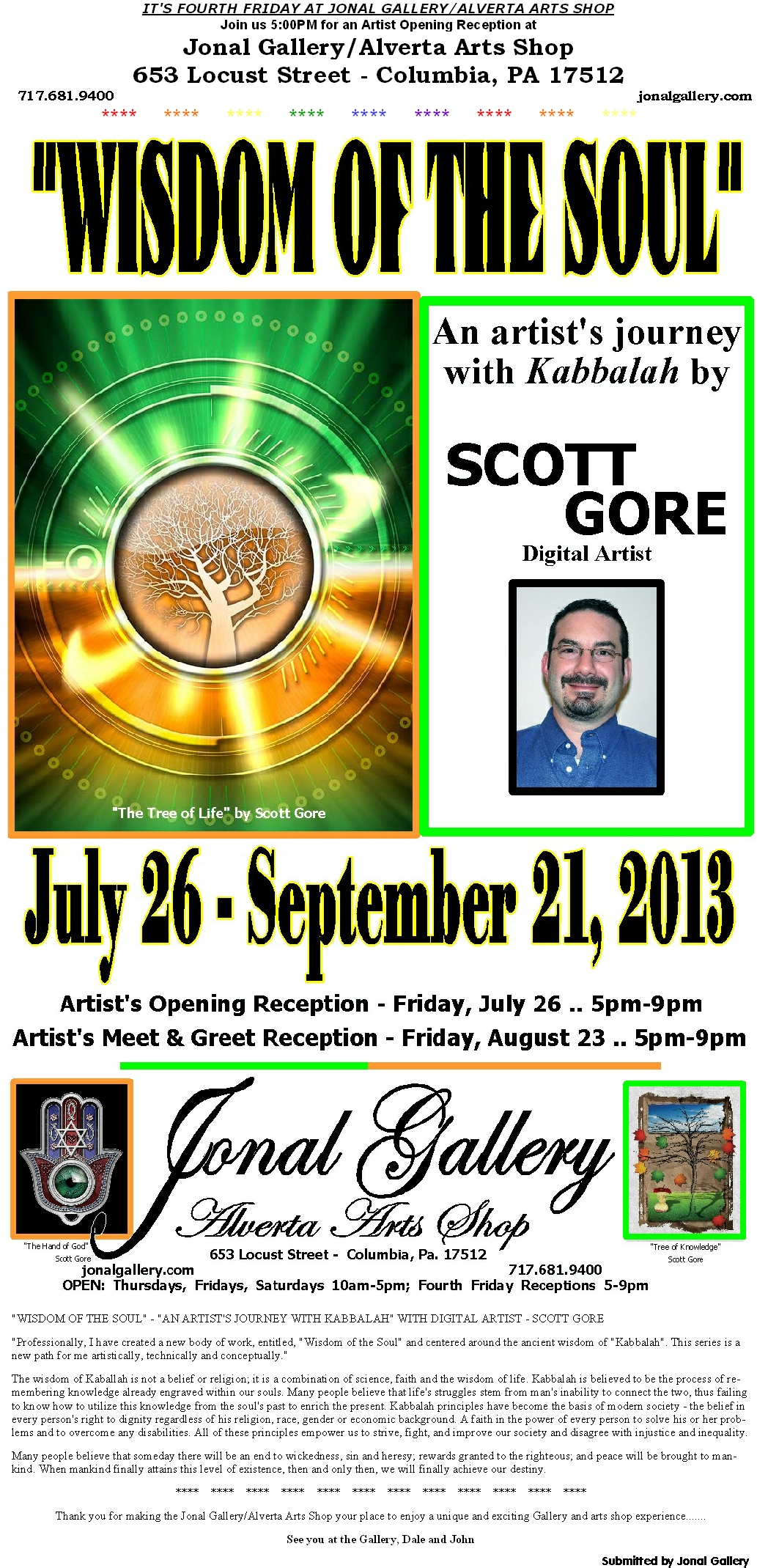 - Jonal Gallery, Columbia, will be hosting Digital Artist Scott Gore. “Wisdom of the Soul – An Artist’s Journey with Kabbalah” focuses on the ancient wisdom of Kabbalah, a combination of science, faith and wisdom of life. Please see our website for more details and a sample of his work.