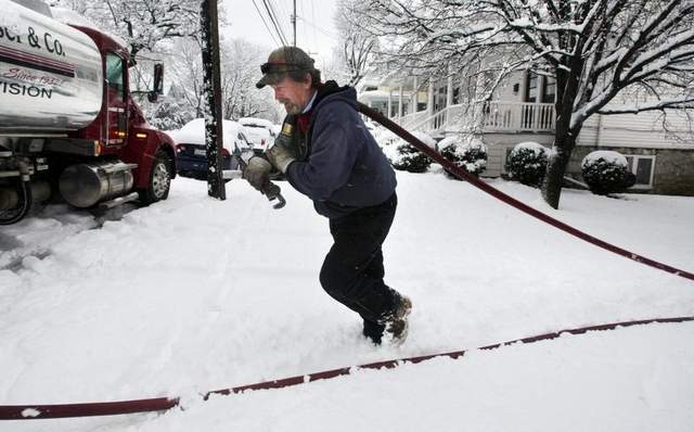 Donald Whitacre returns to his truck after pumping 200 gallons of home heating oil into a customer’s tank in Winchester, Va., earlier this year. (Jeff Taylor / AP)