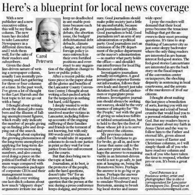 - Last Sunday, the above column appeared in the Sunday News. It is, says the columnist, her “Last Hurrah” and her “last piece.” We read Ms. Petersen’s columns regularly and often disagreed with her stances. In this goodbye column, though, we agree wholeheartedly when she says she “prays that readers will demand that their local press become the tenacious bulldogs that get the answers to their most pressing questions.” She adds, “Good journalish should make polite society just a little bit uncomfortable, because good journalism isn’t polite. Good journalism isn’t an arm of any administration or political party.” Well done, Ms. Petersen, well done.