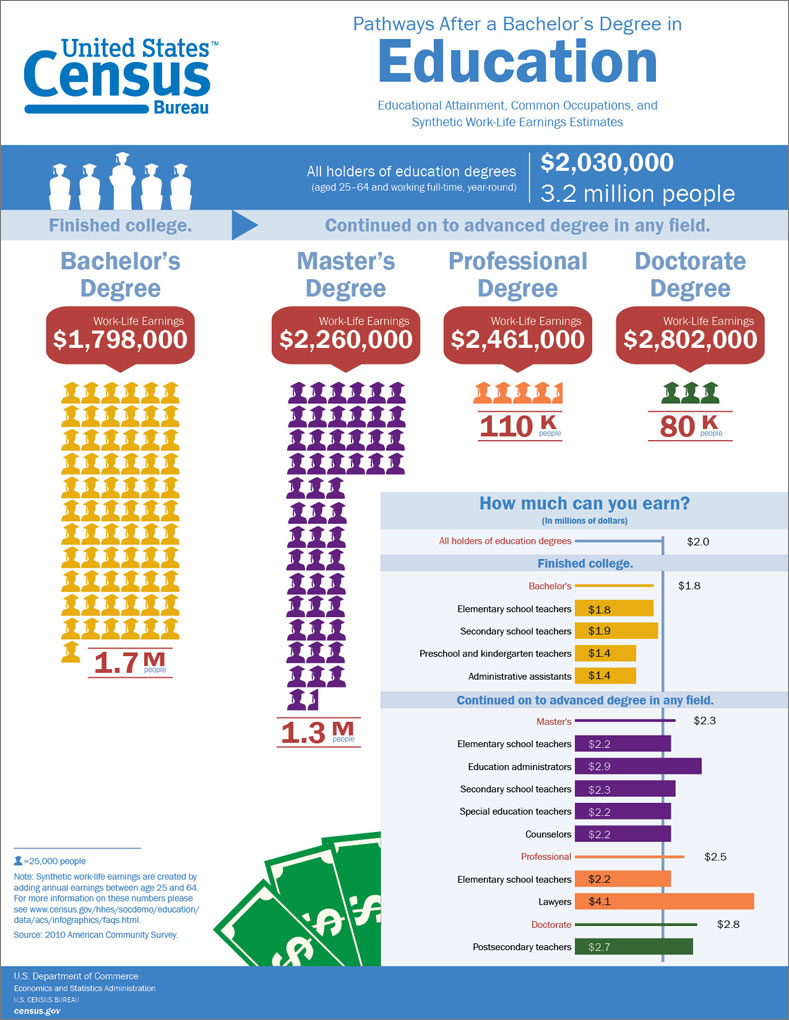 The US Census Bureau has released a series of infographics detailing “pathways after a bachelor’s degree in several disciplines. The number of adults who have completed some graduate school, increased 24 percent from 2008 to 2013, from 29 million to 36 million, according to the Educational Attainment in the United Sates 2012 data release. The report also includes detailed information on years of school completed, showing how many years of education adults have completed for each level of attainment.