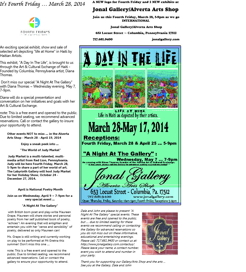 March 26, 2014March 25, 2014 17512 Columbia Jonal Gallery announces Fourth Friday events Share this: Share on Facebook (Opens in new window) Facebook Share on X (Opens in new window) X Like Loading... Related