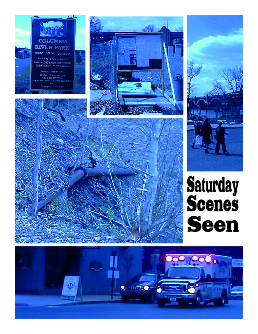 Clockwise from top left: The sign at the entrance of River Park; the park’s getting spruced up. Some new plantings and the rain gardens have been cleaned. Too bad there are so many cigarette buts littering the grounds. This should be a no smoking area, because those cigarette butts get washed, blown and dragged into the River.