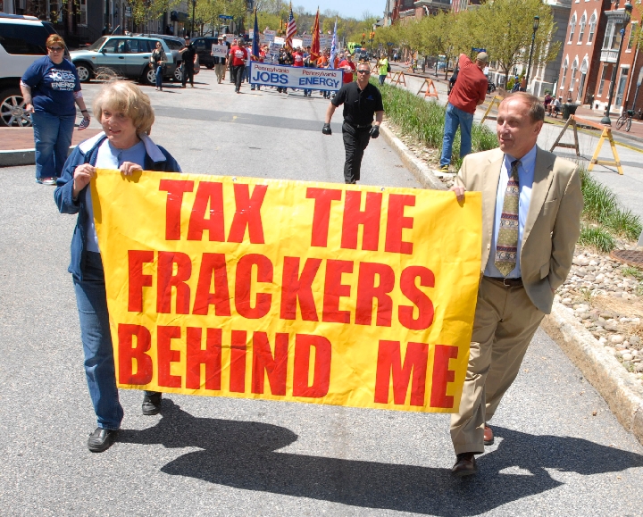 Anti-Fracking demonstrator Gene Stilp, right , marches ahead of the Members of the Marcellus Shale Coalition headed for a rally on the steps of the Pennsylvania state Capitol steps Tuesday, May 6, 2014 in Harrisburg, Pa. The event is intended to let legislators and the public know that a diverse group of people support the natural gas boom that began about six years ago. (AP Photo/Bradley C Bower)