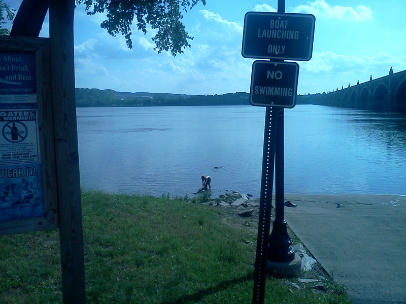 Two boys swimming at the “ole smimmin’ hole.” They didn’t see “no stinkin’ sign.”