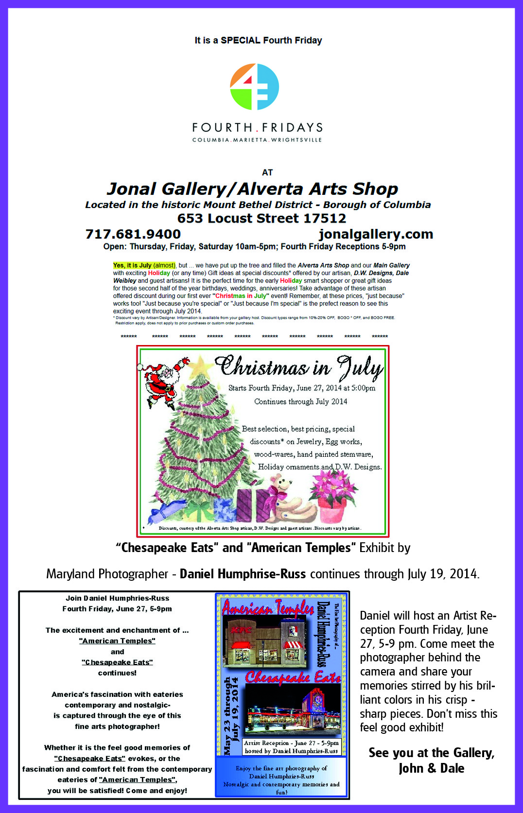 June 23, 2014 17512 Columbia Artist reception on Fourth Friday at Jonal Gallery Share this: Click to share on Facebook (Opens in new window) Facebook Click to share on X (Opens in new window) X Like Loading... Related