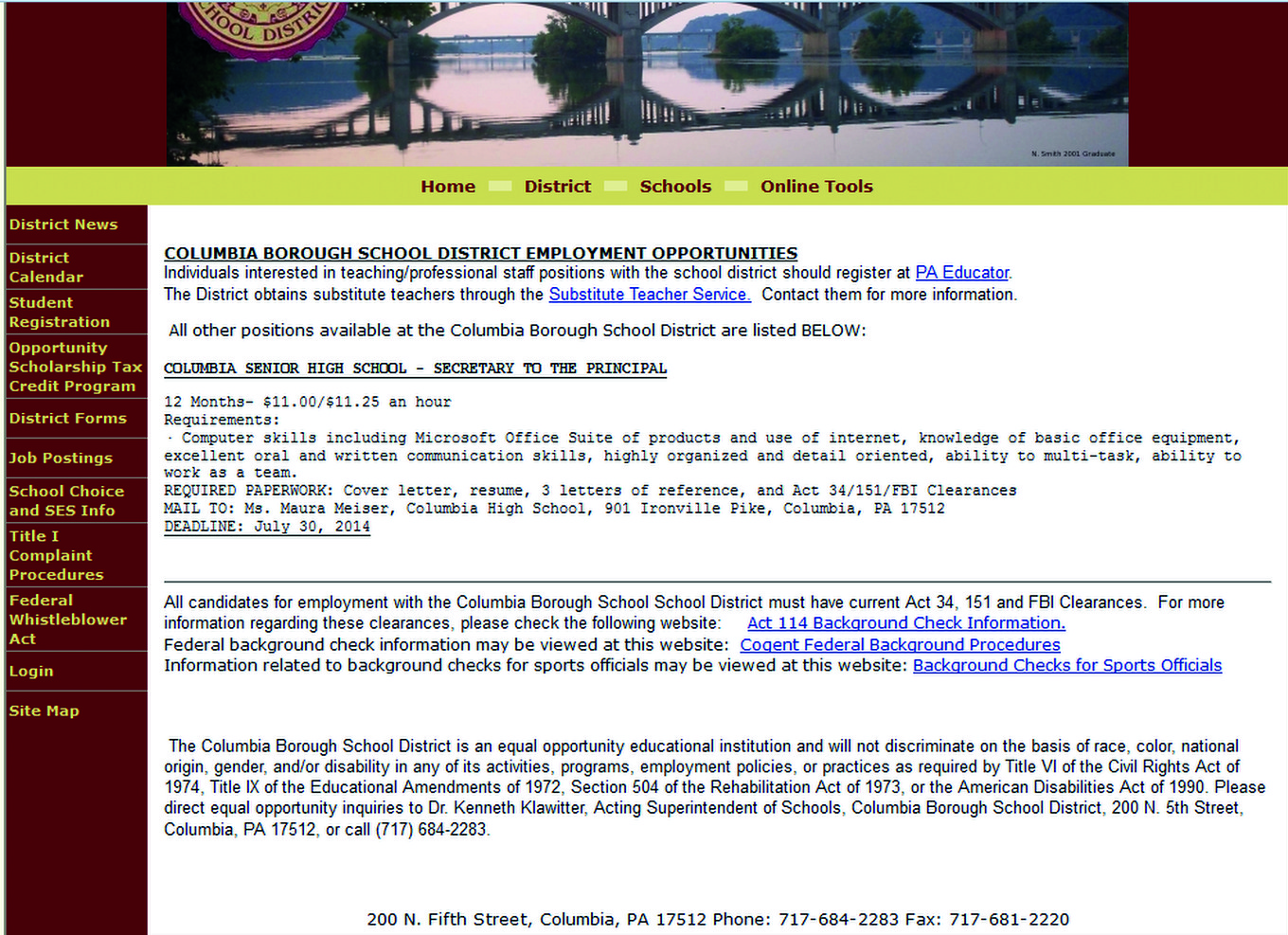 - The above job is posted at the Columbia Borough School District Website; we tried to show the direct link to the page but the Website is so confusing that link pasted into a browser bar does not display the page. To get to the page, click on the link to the school splash page, then click on “Job Postings.”