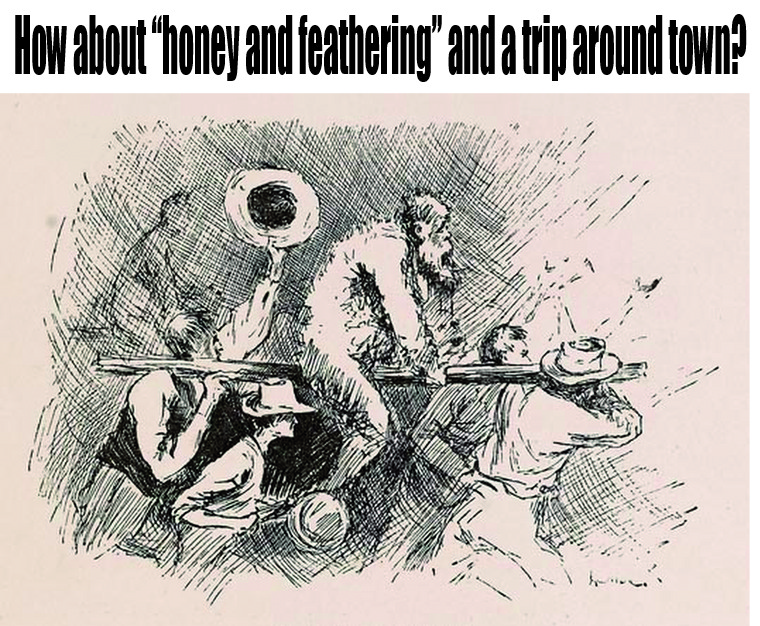 - “Tarring and feathering (was) a form of public humiliation, used to enforce unofficial justice or revenge.” “The aim was to inflict enough miserable pain and humiliation on a person to make him either conform his behavior to the mob’s demands or be driven from town.” – Wikipedia