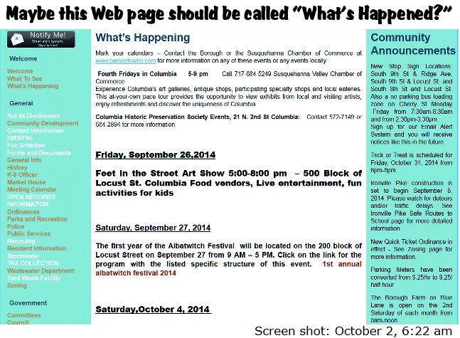 - NOTE: Thanks, Columbia Borough … sometime between the above screen shot and 7:25 pm on Friday eventing, 10/3) the out-of-date entries were deleted.