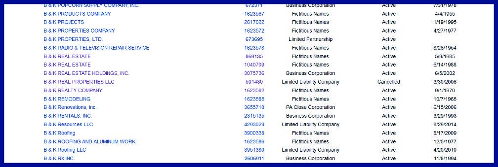 - Obfuscation rules! It’s not real easy to find what is supposed to be public domain information in Pennsylvania. In the Deeds Recorded in today’s Sunday News, B&K Real Estate LLC acquired property on Locust Street. So who is B&K Real Estate LLC? One might expect to find the business name registered with the Pennsylvania Department of State Corporation registration database. Here’s what we found: no listing for B&K Real Estate LLC. Last Week, Columbia news, views & reviews carried this information: The recorded mortgage. – – – 418 Locust Street and 422 Locust Street (This real estate Website shows the properties together) are sold to B&K Real Estate, LLC. for $392,000. That recorded mortgage.