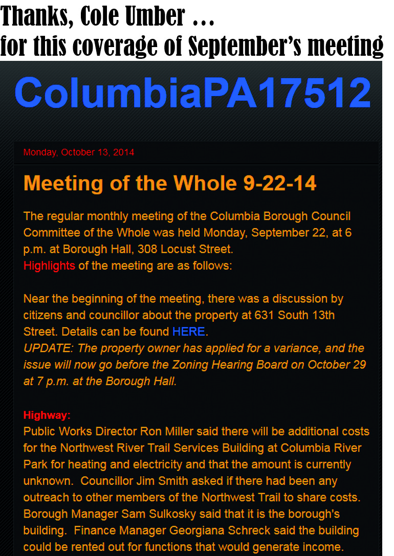 - “Cart before the horse” hearing in Columbia – “LEGAL NOTICE The Zoning Hearing Board of the Borough of Columbia will meet on Wednesday, October 29, 2014, at 7:00 P.M., in the Municipal Building at 308 Locust Street, Columbia, PA, to consider the following application(s) and/or appeal(s): Vincent Fiorella is requesting special exception(s) and/or variance(s) to construct an accessory building at 631 South Thirteenth Street … ” – LancasterOnLine