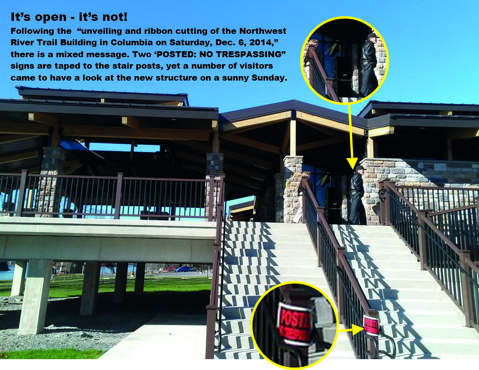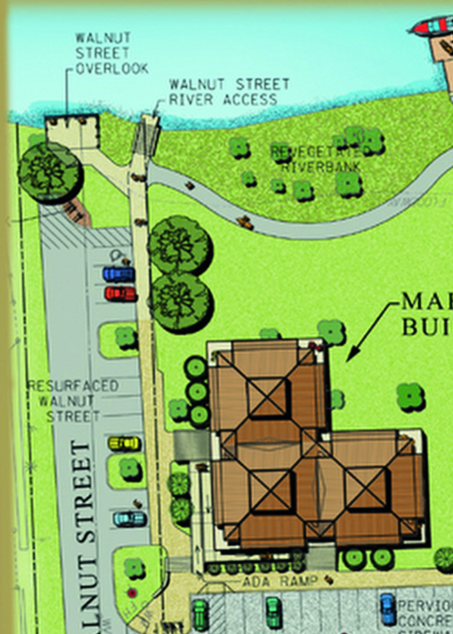 - H-m-m-m, noticed this, too, at the River Park. There’s a “circle-like, cul-de-sac-like” end as Walnut Street ends at the river; that’s different from the “Walnut Street Overlook” the “Walnut Street Ramp” to the initial plan.