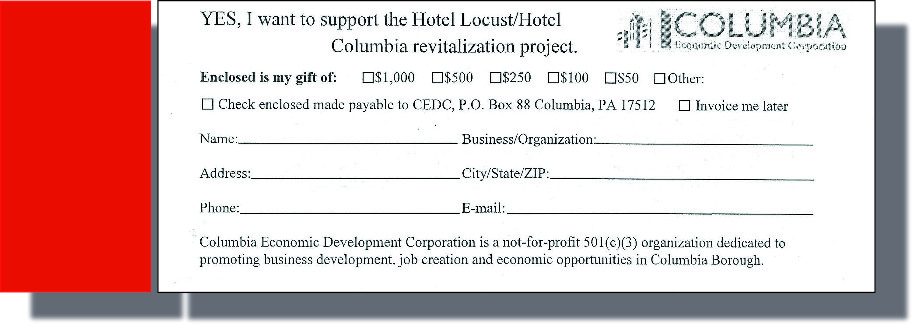A few weeks ago, several local information resources reported that the Columbia Economic Development Corporation (CEDC) was granted an exemption by the borough council from paying the Dumpster Permit Fee; the CEDC’s stated intention was to have a dumpster placed in front of the Hotel Locust and Hotel Columbia for a few days. “The CEDC’s IRS reporting form 990-EZ shows its net assets or fund balances at the end of 2013 as nearly $65K. Could the CEDC have afforded to pay the borough’s fees?”