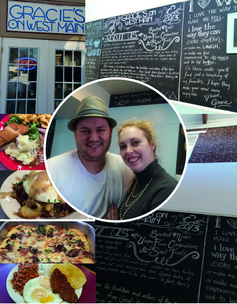 - Gracie’s on West Main is a dining delight! On a venture to the Leola area, a mid-morning breakfast stop at 264 West Main St Leola, PA 17540 was sheer delight. A post breakfast chat with husband-and-wife owners, Mariella “Gracie” Volker and Jim Rutolo, revealed their passions for attention to detail and the extraordinary. Every staff person at Gracie’s mirrored their enthusiasm for serving up a very pleasant dining experience – with an abundant serving of great-tasting food. Everyone smiles – everyone moves with purpose and poise – everyone seems genuinely joyful to welcome patrons to this place, too. When we observed and commented about the “non-flashing open sign” in the window, Gracie noted that the codes officer in the municipality is pretty strict.