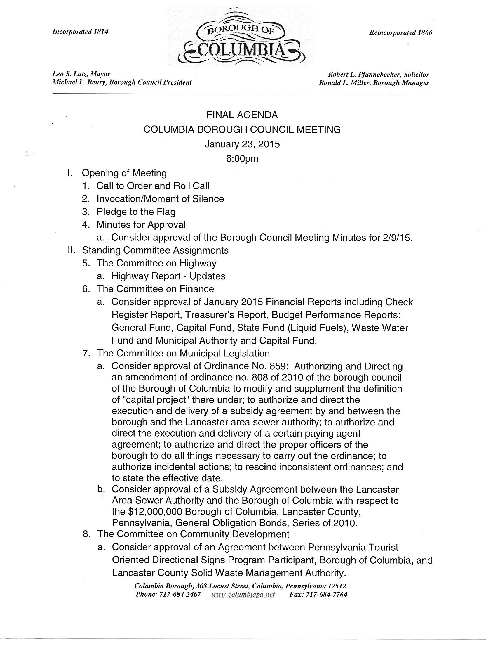 The council of the whole meeting began at 6:00 pm with all the councillors present; also in attendance around the horseshoe table arrangement was the mayor, the interim borough manager (though the agenda clearly states that Ronald Miller is the borough manager) and the borough’s financial officer. In the gallery there were, perhaps as many as eight persons were there to watch or speak on behalf of topics pertinent to some.