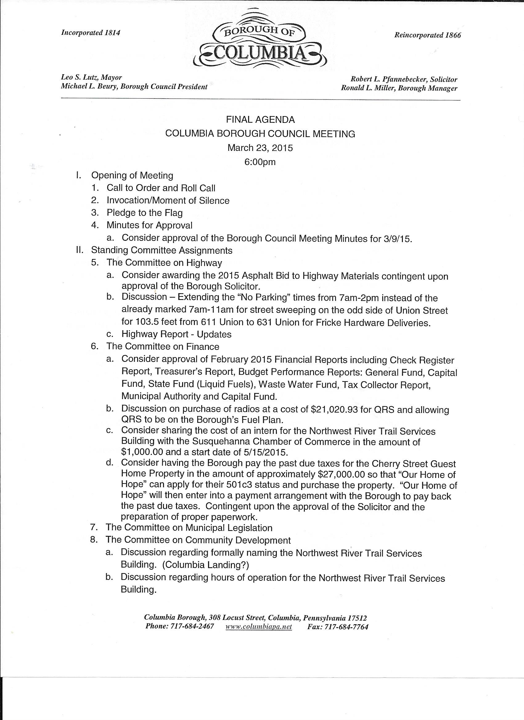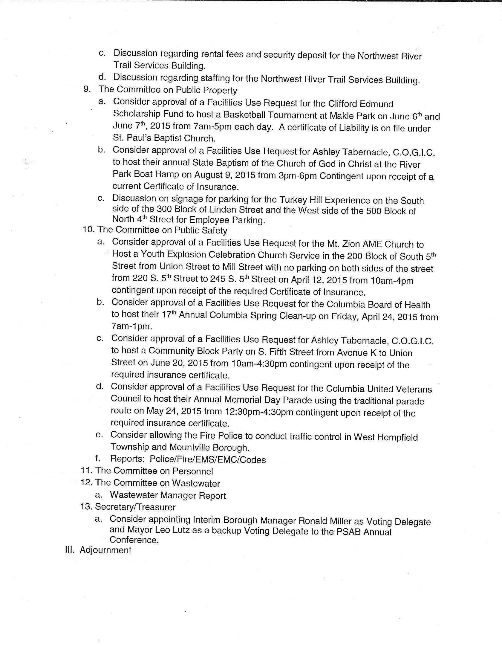 March 24, 2015 17512 Columbia March 23, 2015 council of the whole agenda Agenda – side one Agenda – side two Last night’s meeting was called to order at 6:02 pm; it was adjourned at 10:42 pm … a four hour and 40 minute meeting. Columbia news, views and reviews will recap points from the meeting in separate posts. Share this: Click to share on Facebook (Opens in new window) Facebook Click to share on X (Opens in new window) X Like Loading... Related