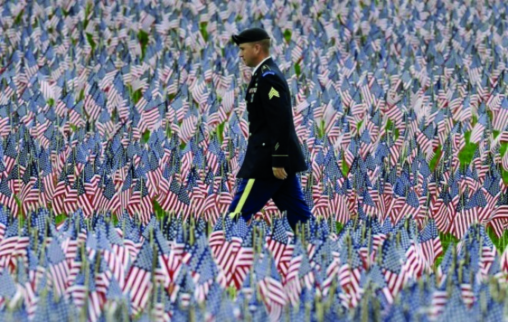 A U.S. soldier walks on a path through the Massachusetts Military Heroes Fund flag garden on Boston Common in Boston on Thursday, ahead of Memorial Day. Each of the approximately 37,000 flags represents a Massachusetts service member who has died. (AP Photo/Michael Dwyer)